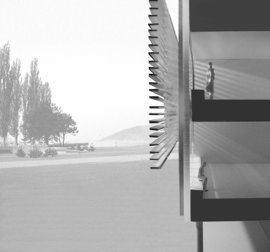 It will therefore keep the integrity of Schlup’s design, and in the same time create a contemporary response to the site and to the climate. It is also interesting to know that the fixing system of the new shadings will fit into Schlup’s profile of the facade. It would be also a reversible feature and is thus in concordance with the Venice’s Chart regarding the Monuments’ remodelling.