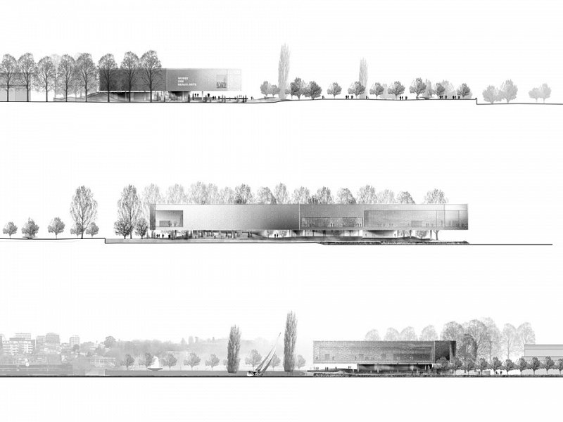 La relocalisation du musée cantonal des Beaux-Arts sur le site de Bellerive est l‘occasion de réaliser de manière pérène la relation entre la ville haute et le lac Léman, de formaliser l‘entrée dans la ville urbaine depuis la Maladière et de redynamiser l‘ensemble du quartier sous-gare. Le grand site du bord de lac, enfant de l‘Expo 64, a créé un poumon vert, mais il a aussi partiellement amputé le pied de rive de la ville derrière un rideau d‘arbres et d‘installations sportives, périurbaines. Les quais d‘Ouchy, à l‘est, ont gardé leur force paisible. Le site de Bellerive souffre d‘une forme d‘indécision dans sa relation au lac, accentué par la présence de parkings et d‘activités économiques (Sagrave et entrepôts de la CGN). Le parti architectural adopte une attitude radicale, qui renforce le lien dans le pente avec la ville, notamment la gare CFF, et formalise la vision d‘un grand parc urbain, de Montriond à Bellerive, aux multiples accès, traversé d‘artères urbaines, en aménageant l‘esplanade de Bellerive avec une arborisation dense et en créant un bâtiment bas détaché du sol, réaménagé en un nouveau parc urbain. Doté de points de vue spectaculaires, il ménage des endroits naturels et intimes. Les activités publiques, comme la librairie, le café, etc., seront logées en son contact direct et en augmente l‘attrait. Le musée est installé à l‘étage sur un seul niveau, de hauteur constante si nécessaire, et offre une large flexibilité d‘usage pour son unique destination: créer les conditions optimales de conservation, d‘étude et d‘exposition des collections, ainsi que de présentation d‘expositions temporaires. Le système porteur constitué de grands cadres métalliques, auxquels sont suspendus les planchers, permet une reconfiguration ultérieure des cloisonnements, avec un nombre réduit de porteurs. Les réseaux techniques sont intégrés dans l‘épaisseur constructive des sommiers et sur des mezzanines. La façade-rideau permet la libre disposition des ouvertures, selon les besoins fonctionnels et de vues. Une maille métallique enrobe le bâtiment, offrant protection solaire et unifiant le tout en un corps léger, filigrane et élégant, mais aussi durable. Des lanterneaux, ainsi que des larges ouvertures vers un cour intérieure ombragée, apporte lumière naturelle et vues en dialogue avec la découverte des expositions et des collections. Un grand déambulatoire, au sud, offre aux visiteurs une vision panoramique en porte-à-faux sur le Lac Léman.